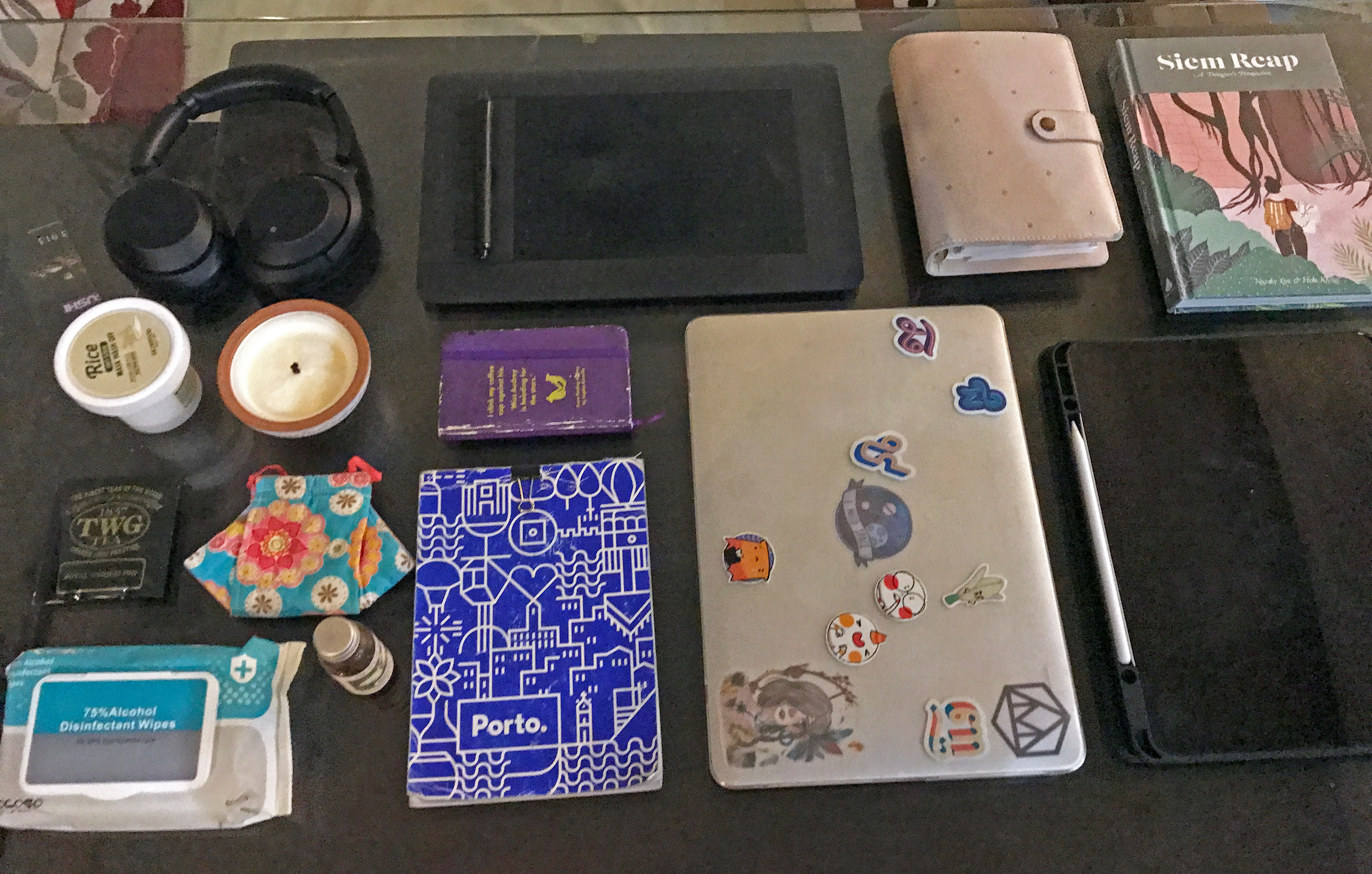 1-4. My laptop, tablet, iPad, and headphones are essentials because I work from home